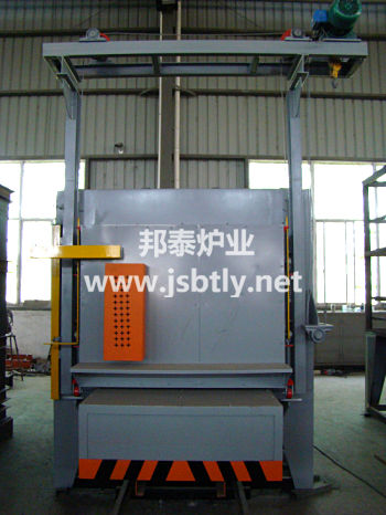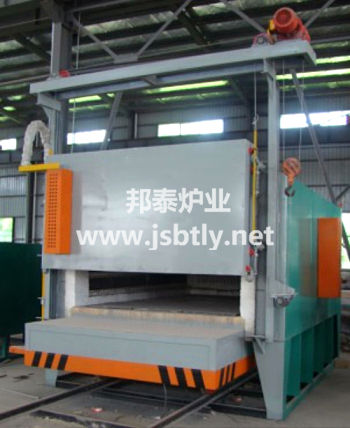 本爐為臺(tái)車式電阻爐,工件加熱時(shí),將臺(tái)車開出爐體外,將工件擺放在臺(tái)車上。